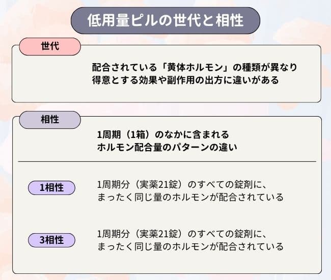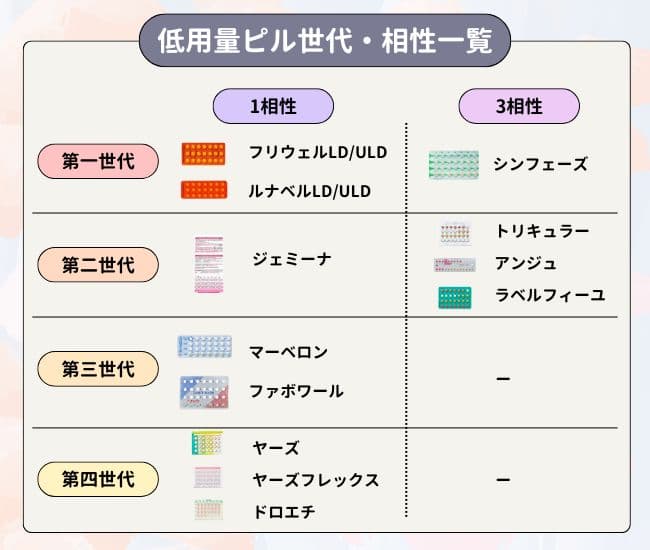 低用量ピルは、配合されている黄体ホルモンの種類によって第一〜第四世代に分けられます。