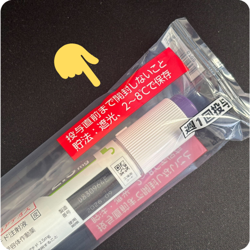 一方、包まれている袋には「投与直前まで開封しないこと」という記載があり、開封済みや破損していないかはチェックが必要です。